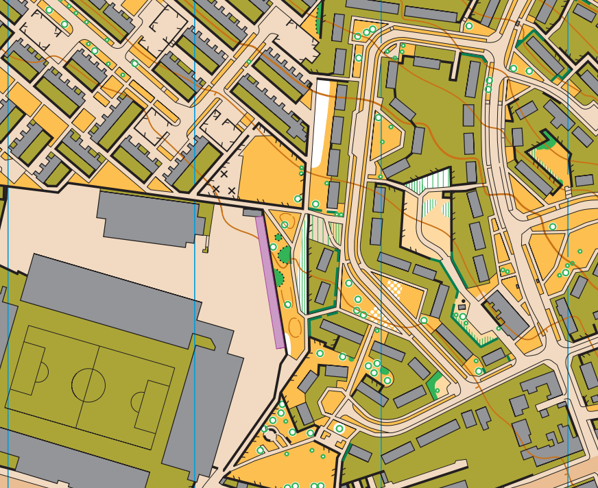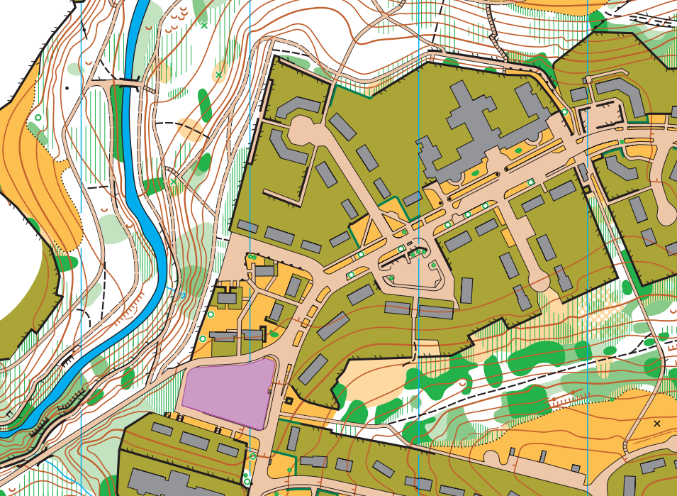 A suburb of Falkirk which actually has quite a lot of woodland between the blocks of housing. The slopes are fairly big which makes for interesting longer route choices. It can be tricky to keep things readable when you get paths traversing steep slopes, especially if there are other black features like fences and crags, so sometimes it's necessary to distort things from their true positions to keep the legibility; no-one will notice the distortion, it only seems big when you're zoomed right in.