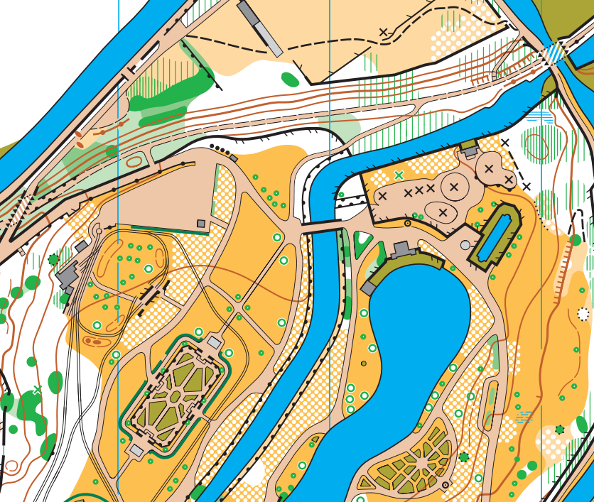 An interesting area comprising three parks with rivers and canals running through them. Victorian style formal gardens and a small railway were a challenge to map legibly! There was even an aqueduct! Mapped in December 2024, I'm now being careful with not leaving half a white circle at the edges of the scattered trees areas (except when bounded by e.g. a black line) and it looks much cleaner.