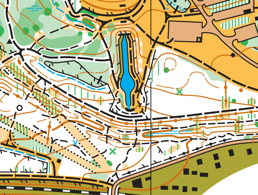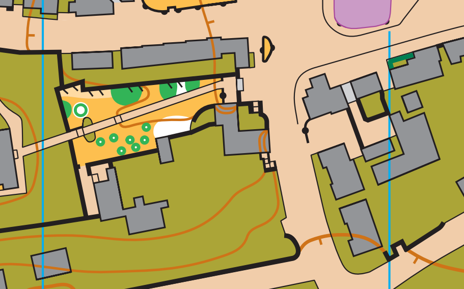 Another fairly standard sprint map, but a good chance to show an example of how contours should work. Contours inside buildings clearly don't mean anything in themselves, but here they show that the walls and steps on each side of the building are about 2 contours high. Contours cross roads at, or close to, 90 degrees, and with tags, because when you make a route choice in sprint you usually only look at the routes i.e. the roads, so tags means you can assess the climb without having to look elsewhere to work out which way is up/down. Inside olive green areas any contour detail is useless, so in fact arguably I've mapped a slight reentrant here that should be smoothed out.