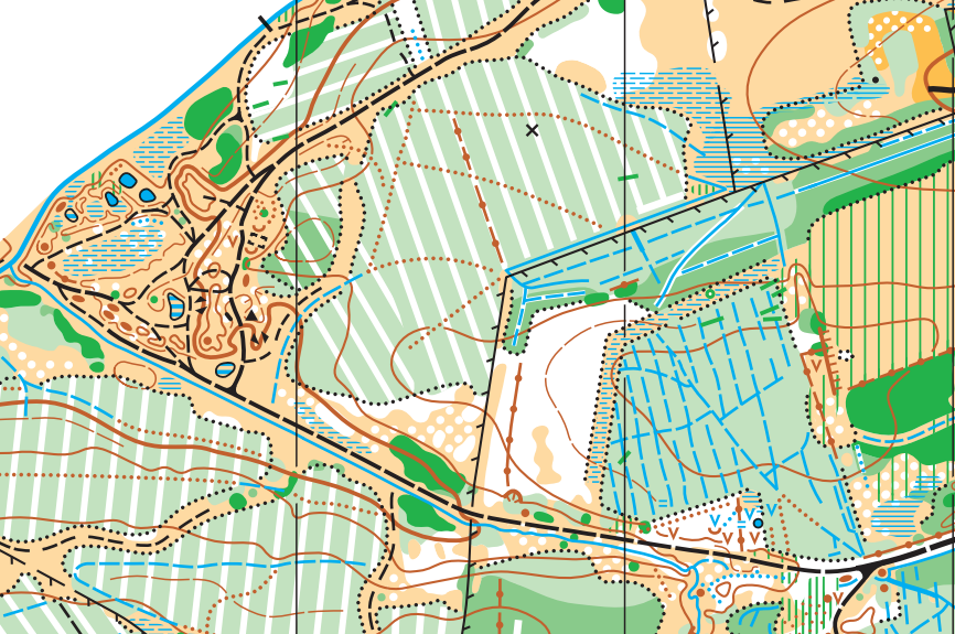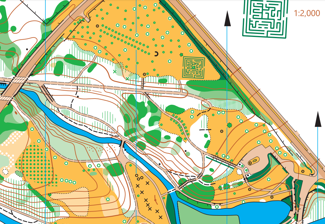 A fairly standard park, but with added interest of a maze, some stepping stones across the river and various bridges. The orchard symbol got a rare outing, and though for some reason the edges look untidy on this image I promise they look neat on the OCAD! To the east of there, I kept the broken ground dots from touching the contours, which I think is the correct thing to do, but I hope no-one interpreted it as four separate areas of broken ground. There wasn't a lot of contour detail in this area so I kept them nice and smooth. KFO used it for a local event recently. Routegadget.
