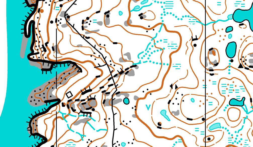 Lots of human activity in an area usually makes for challenging mapping. ISOM works most naturally when the forest is wilderness, untouched by man. In this example, the long linear reentrant and parallel earthwall are the line of the Antonine Wall, built around 150 AD. The track parallel to the railway in the SW is the route of a Roman road and the railway was (I think) built in Victorian times. Falkirk Wheel itself, with the canal and tunnel (not mapped), was built in 2002. I have no idea when the various fences were built, nor the (unmapped) power lines which run along the linear rough open areas. The black circle in the west is a forest school (which has been heavily simplified).