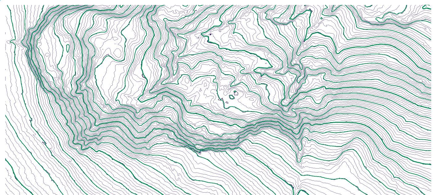 So, the first step was tracing out 5m contours from the 1m LiDAR data, using my best judgement for smoothing out the jaggedness, and using form lines to include obvious contour shapes which fall between the 5m contours. Due to the small size of the area, and the level of detail I wanted to map, I chose to make the map at 1:5,000, rather than the usual 1:10,000.