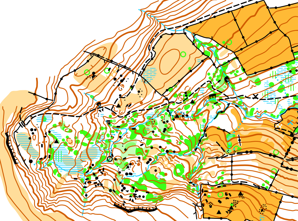 I traced out the walls/fences from the OS map. I could trace out the 5m contours too, but they are nowhere near as accurate as LiDAR data, openly available from the Environment Agency. LiDAR doesn't cover the entire country and you sometimes get gaps, which unfortunately included the Northernmost section of the area. This is the least interesting part of the map though, so not to worry. You need OCAD (or QGIS but that is more uncommon) to convert the LiDAR data into (1m) contours, but after doing so the raw data is jagged and messy in places.