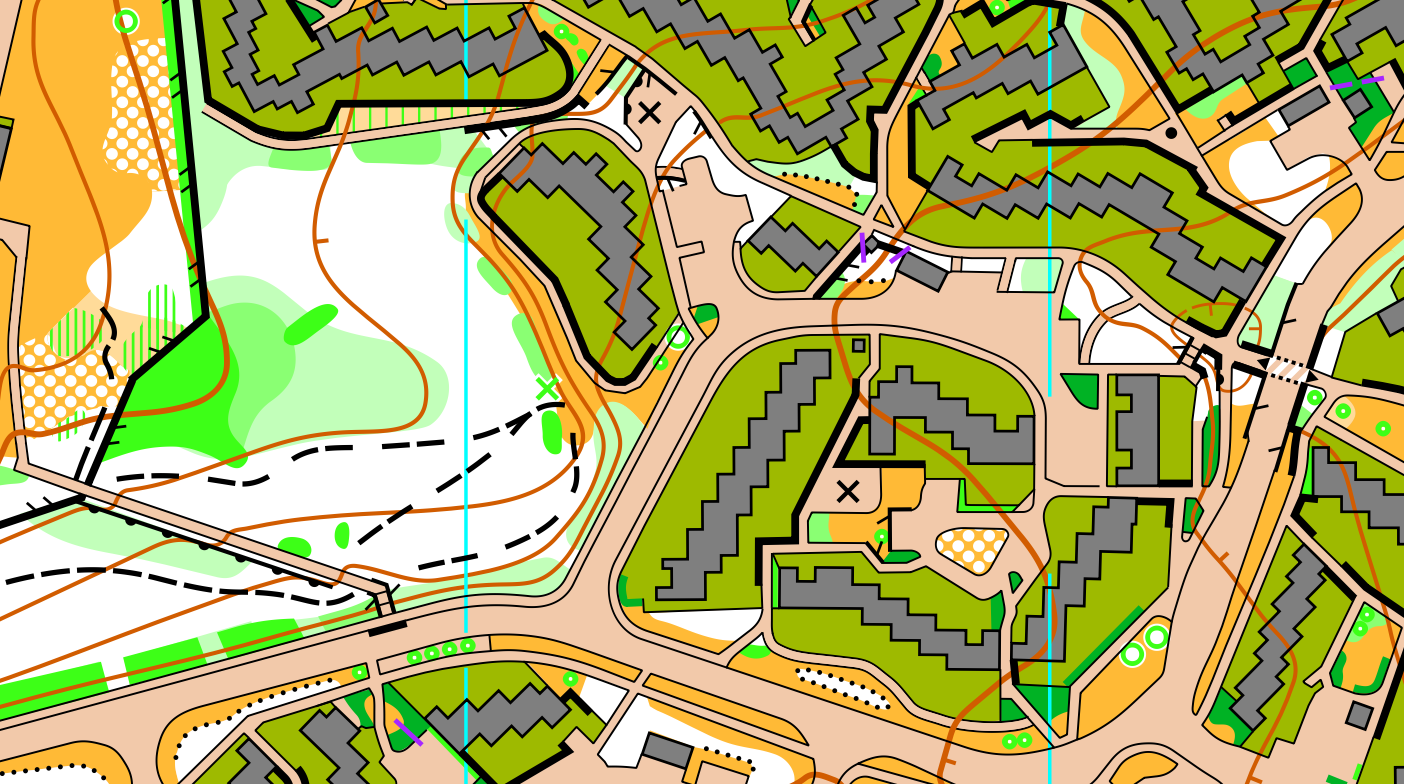 Glenrothes is interesting in that it has many patches of woodland between the housing estates, especially in the north. Including sections of forest in a sprint can be another controversial subject. Generally it is considered acceptable to include sections of runnable forest, but not to have technically difficult forest orienteering.
