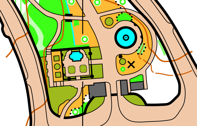 One slightly annoying thing about using the OOM app is that you can't make a super neat and tidy map, because you can't snap new objects onto the boundaries of existing objects like you can on a computer. Often you can make things tidy by overlapping one into the other and remembering which will be 'on top'. For example, an area of yellow sits under a paved area, so if you overlap yellow into a paved area you'll get a neat boundary, without having to draw if perfectly along the edge. In the end, I still spent a couple of hours at home afterwards tidying up all the bits where this isn't possible.