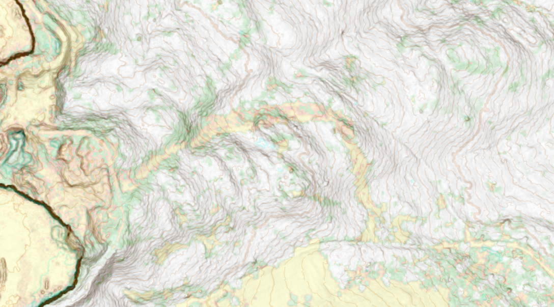 - Boulder fields not interfering with any other black things (except north lines). I thought it was more important to keep the tags on the cliffs than to show that the boulder fields went right up to the base of them.