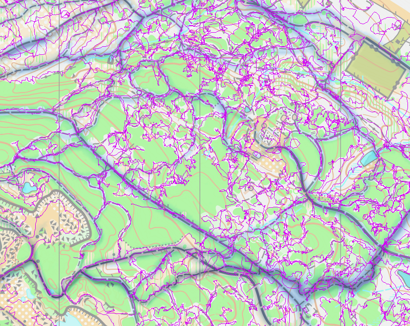 For double checking the paths, I got the Strava heatmap up in the background, which is obviously GPS based too, but at least is an average of many people's GPS. The lines are pretty wide and blurry but it was useful as a second check.